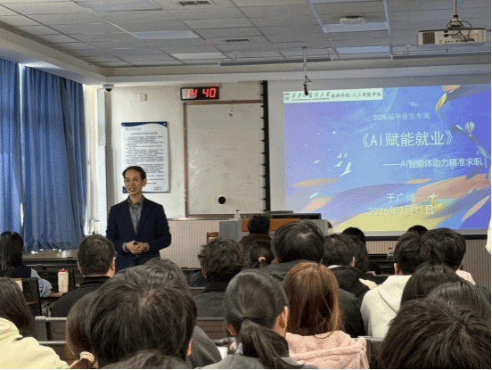 于3月11日下午在JE510举办“AI赋能就业”专题指导讲座,邀请资深就业指导专家、国家高级人力资源管理师于广阔带来AI工具求职实操干货,为毕业生搭建起AI与就业、学业结合的高效桥梁。
