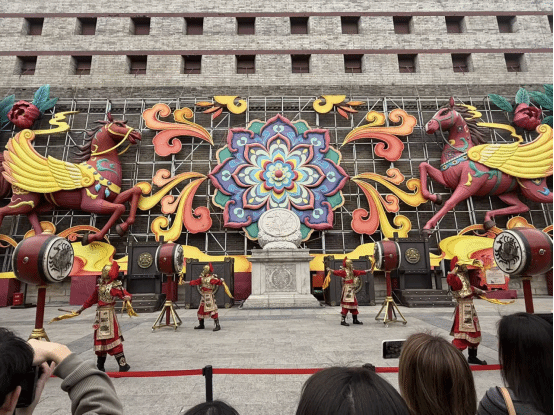 师生现场观看了城墙特色演艺《盛世鼓舞》——四位身着铠甲的武士与一位女演员联袂演绎鼓乐与仪仗展演,气势恢宏、节奏铿锵,生动再现了古都长安的盛世气象,带来一场沉浸式的文化体验。